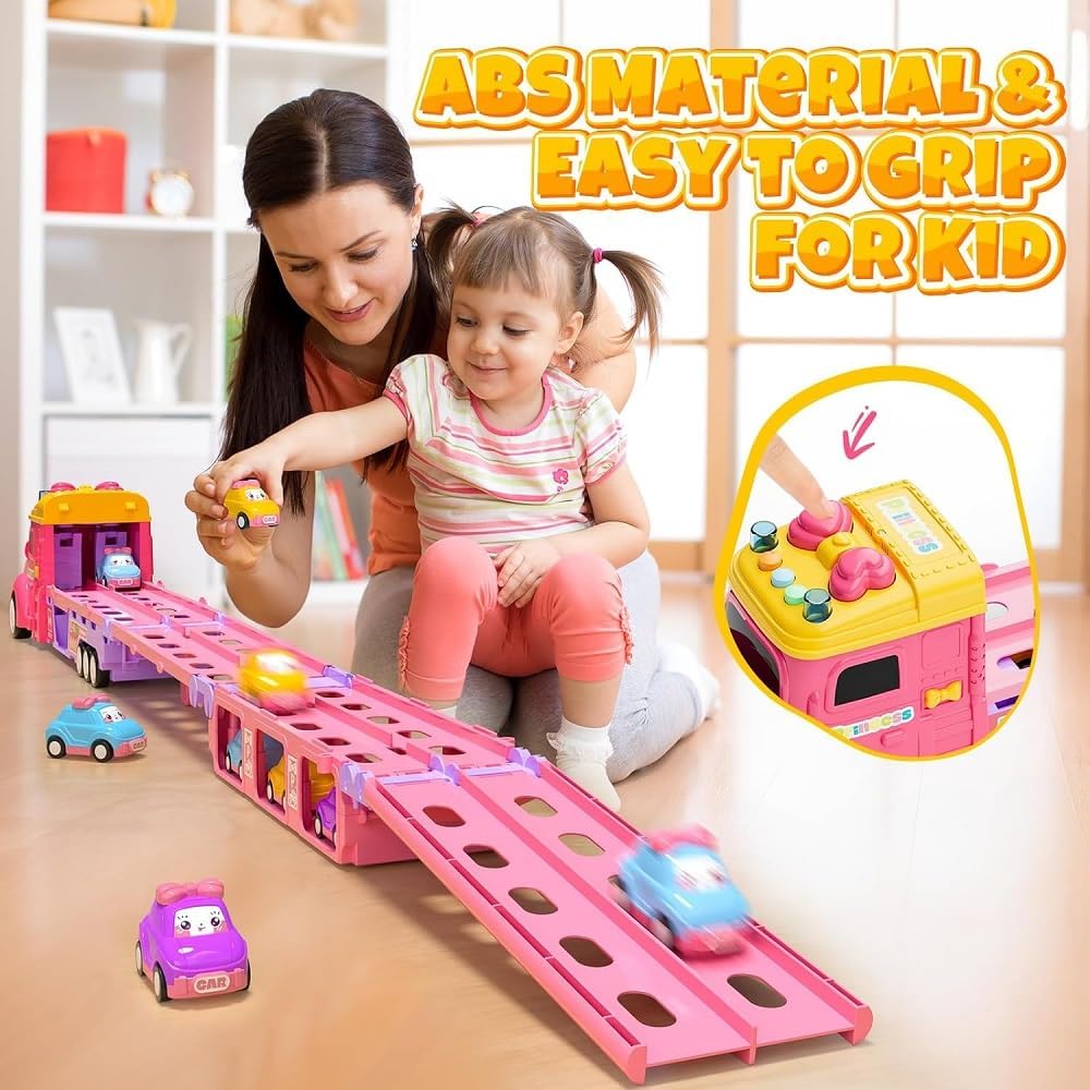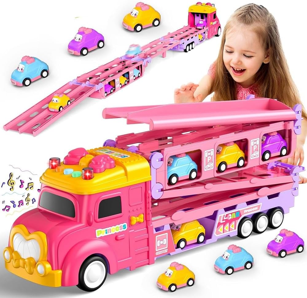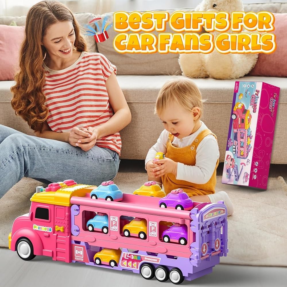 - Princess Truck Toy: This truck toy features a charming princess carrier truck and 6 small cars, coming with pink design truck toys for girls who love truck toys. The large carrier truck can be unfolded into two car tracks for racing. The rich color matching cute cartoon expression unique body printing brings more fun to the transport truck toy set.