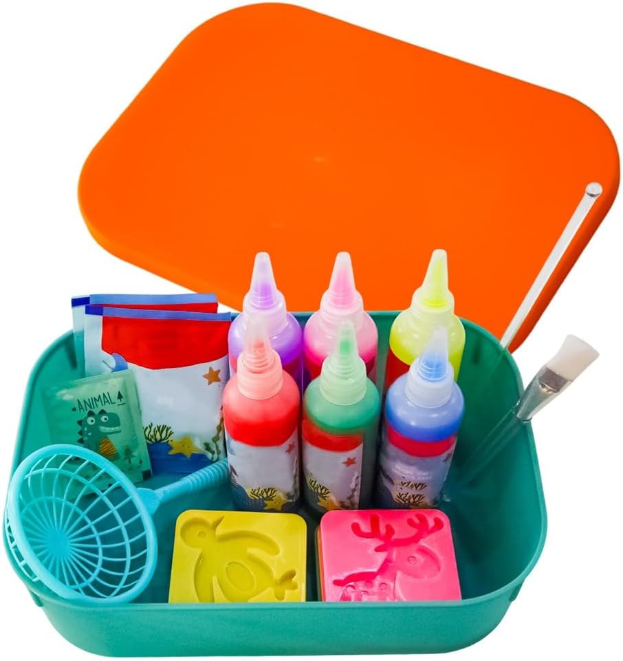 - [DIY Craft Kit] Comes with 6 vibrant color bottles for endless color combinations, 1 water container, 6 unique molds in playful shapes like dinosaur, butterflies, and sea creatures, plus 3 packets of magic water beads that expand to create squishy, one brush and one fishing net. Everything your child needs for hours of imaginative, hands-on fun!
