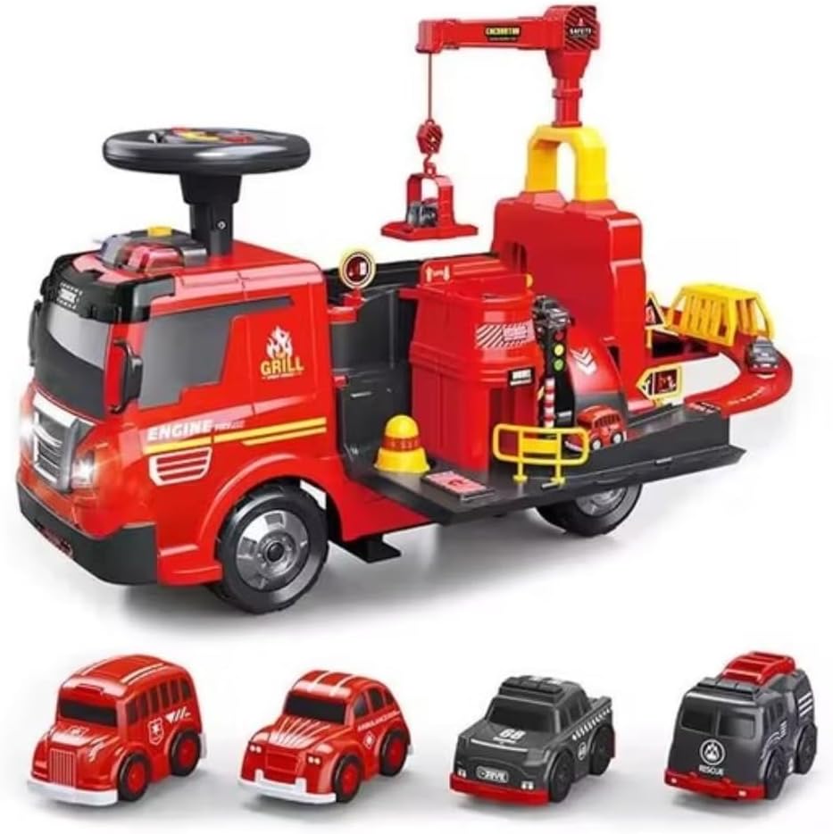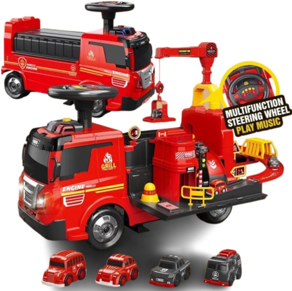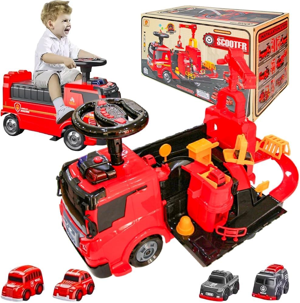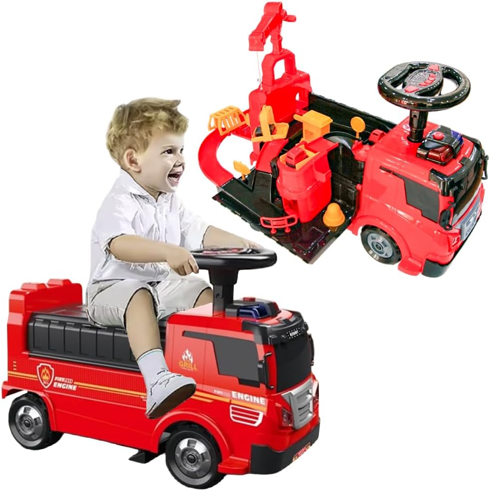 - 🚒2-in-1 Ride-On and Fire Truck Playset: This fire truck push car is designed to provide double the fun! It easily transforms from a sturdy ride-on vehicle, allowing kids to cruise around, into an interactive fire truck playset loaded with rescue-themed features.