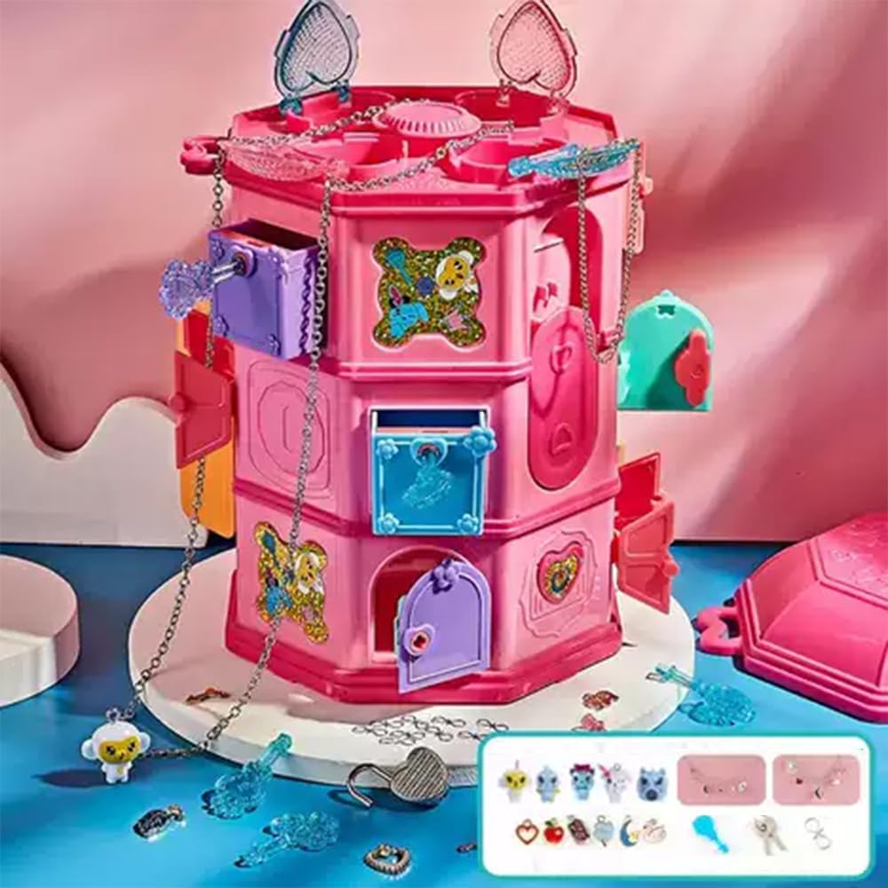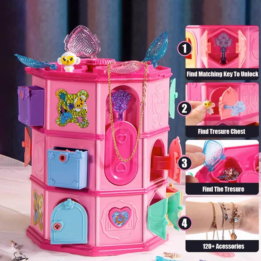 Step into a world of mystery and glamour with the Secret Surprise Treasure Hunt Tower! This escape-room-style puzzle box features hidden doors, secret drawers, and over 25 surprises waiting to be discovered. Use the uniquely shaped keys to unlock compartments filled with collectible charms, hidden notes, and dazzling treasures.