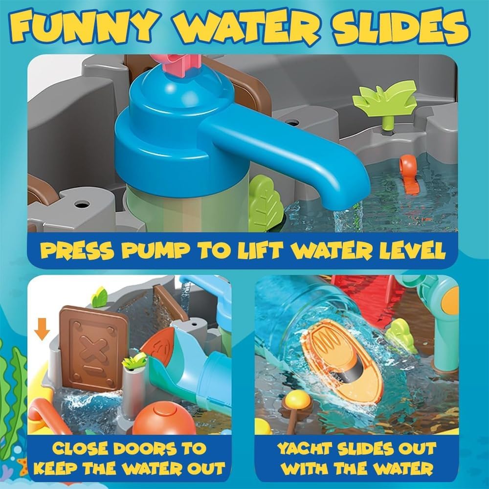 - [WATER PLAY] This water table includes magnetic fishing, a water pump, spiral slide, rotating current track, and colorful marine creatures. Designed to entertain for hours, it helps toddlers develop motor skills, imagination, and coordination while playing indoors or outdoors. Perfect for hands-on learning and splash-filled adventures that keep kids engaged and active all summer long.